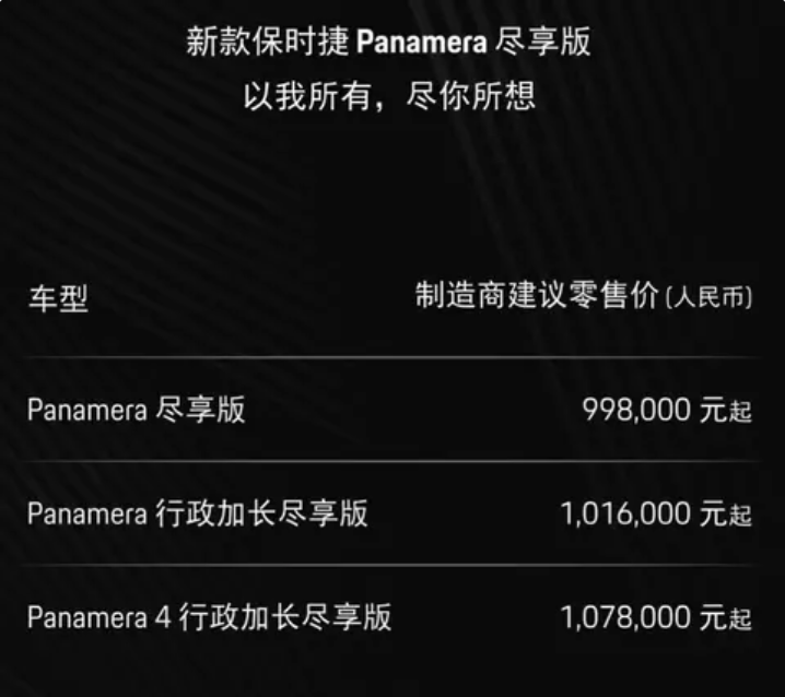 售价99.8万元起,保时捷Panamera尽享版上市,价格配置调整