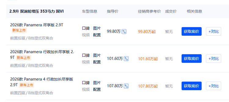 3月20日,保时捷正式推出2026款Panamera 2.9T系列车型,共发布尽享版、行政加长尽享版、4行政加长尽享版三款配置,官方指导价区间99.80万-107.80万元,定位豪华大型掀背轿跑。