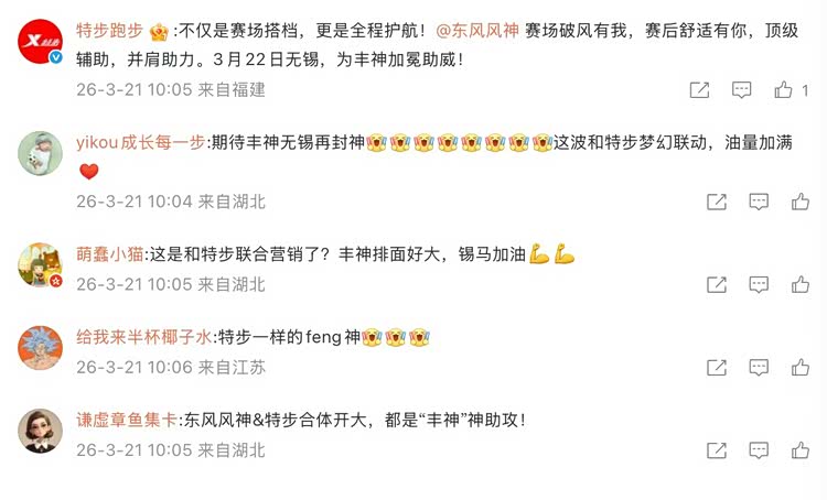 而在线上平台,#丰配友✖东风风神#相关话题热度持续攀升,双方官方账号互动频频,粉丝纷纷晒出打卡瞬间,形成线上线下双向引流。此次跨界联动,不仅实现了品牌与用户的高效链接,更让“长距离不妥协”的精神从赛道延伸至更广阔的生活场景。