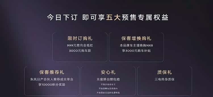 东风 日产NX8(参数|询价)正式开启预售,但并没有公布预售价,即刻下定可享五大专属权益,包含订购礼等,新车有望在4月份完成上市。