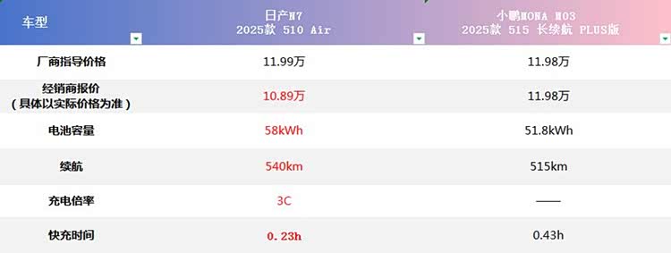 以上是两款车的指导价格,其中,日产N7青春版的优惠幅度很大,终端足足具有1.1万的优惠,其实际价格为10.89万,让中高级纯电轿车迈入10万级时代;而小鹏MONAM03则没有优惠,相比来看,日产N7青春版要比小鹏MONAM03便宜1万,展现出了更加亲民的一面。