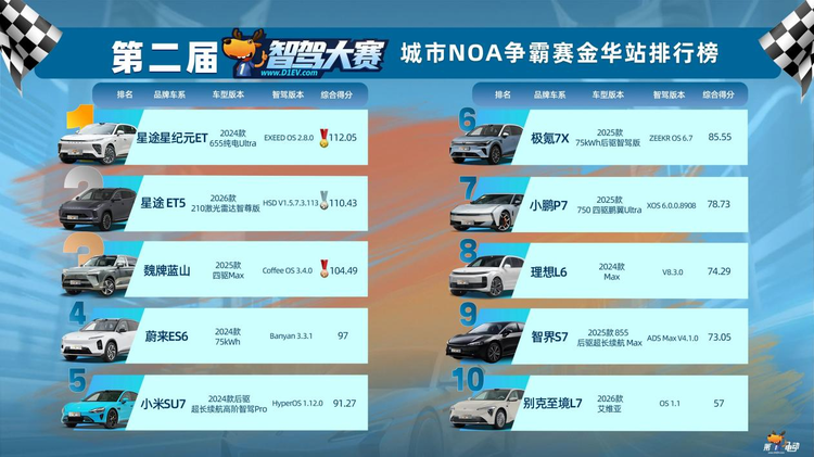 第二届智驾大赛2026城市NOA播主争霸赛金华站的比拼,在3月22日这一天正式落下帷幕。这场聚焦量产车真实智驾能力的公开赛,汇集了众多主流品牌的当红车型,在真实的城市道路上展开了一场硬核较量。最终,星途成为最大赢家。星纪元ET以总分112.05分的成绩斩获冠军,首次参赛的星途ET5则以110.43分拿下亚军。星途家族强势包揽冠亚军。猎鹰智驾的实力,在金华街头得到了最直观的印证。