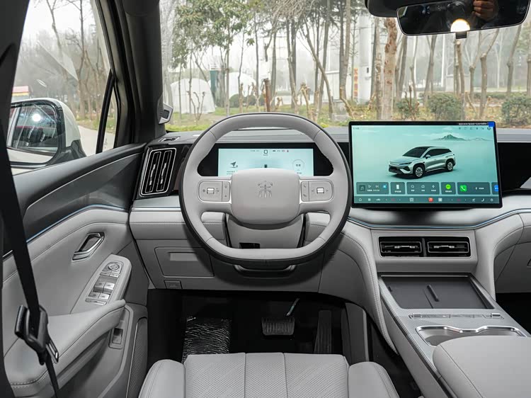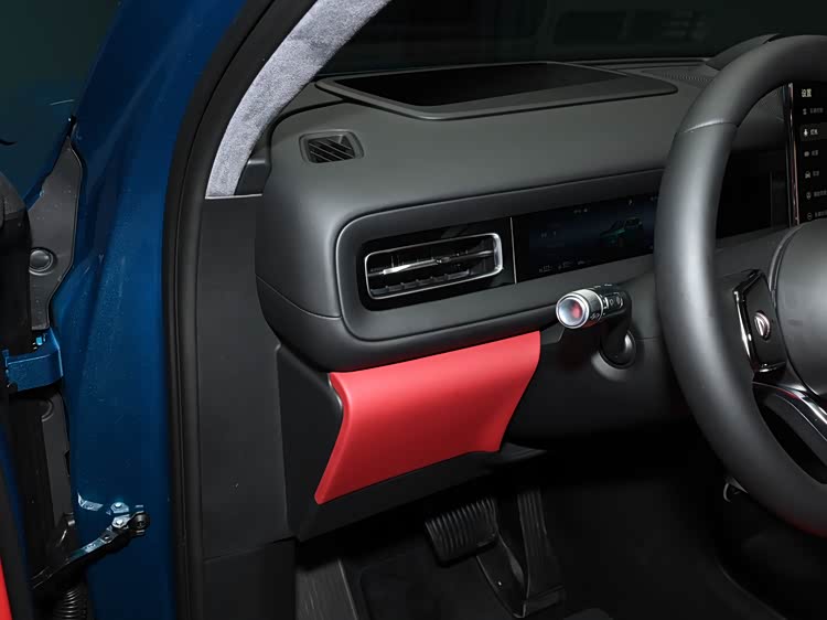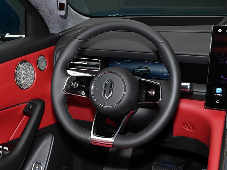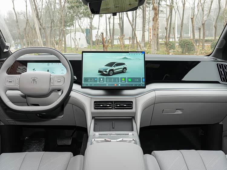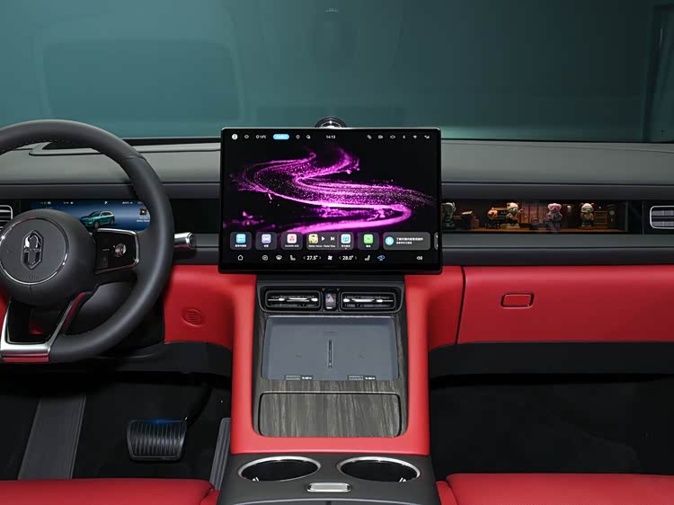 内饰采用双拼配色方案,并加入长条形液晶仪表与D型方向盘。中控屏支持左右移动,这种结构在当前车型中并不常见,核心逻辑在于提升主副驾之间的交互灵活性。副驾驶区域配备独立娱乐屏,被称为“副驾灵感橱窗”,更偏向长途乘坐场景。中控区域的布局强调屏幕与操作区域的分离,减少误触。
