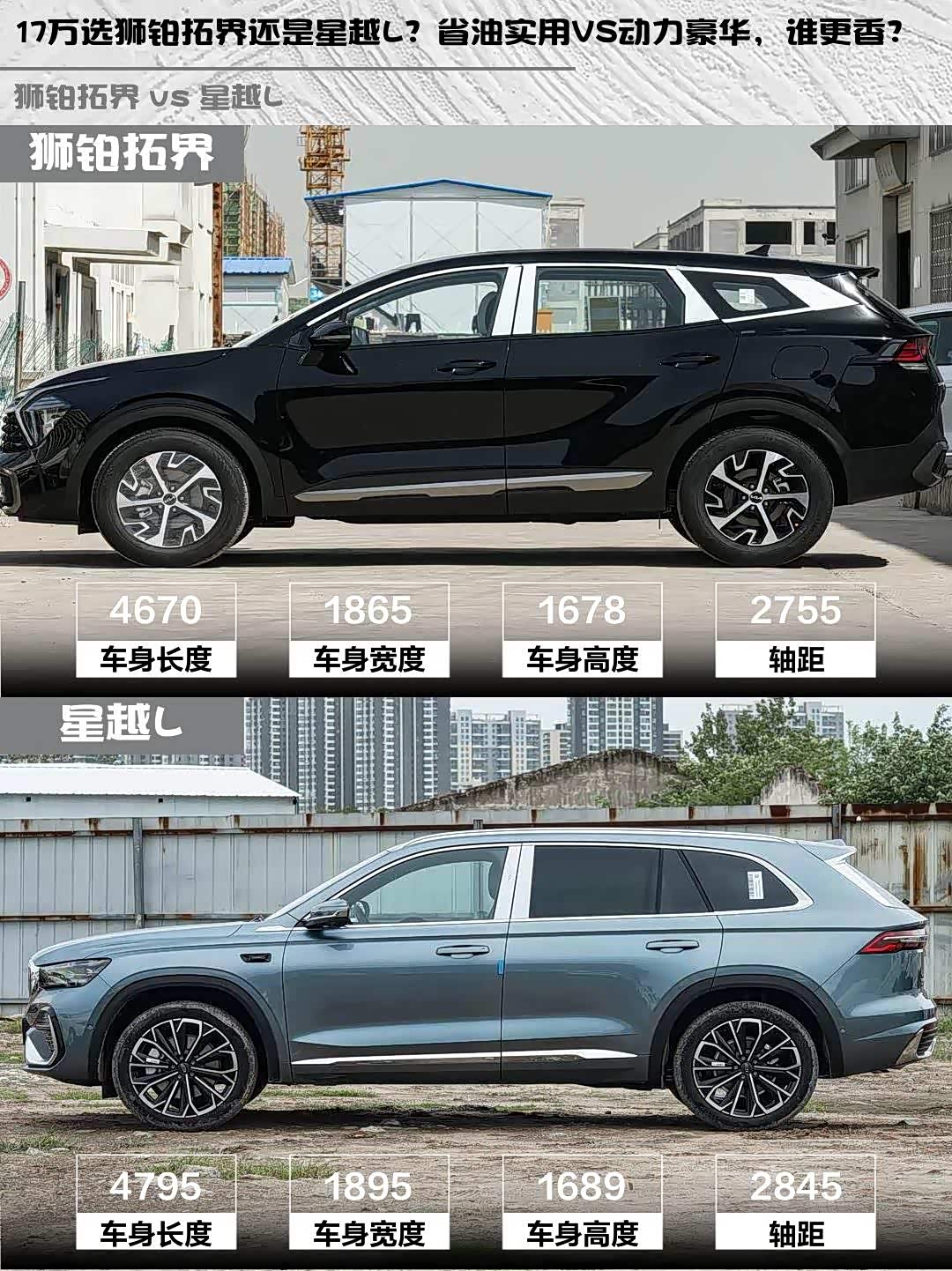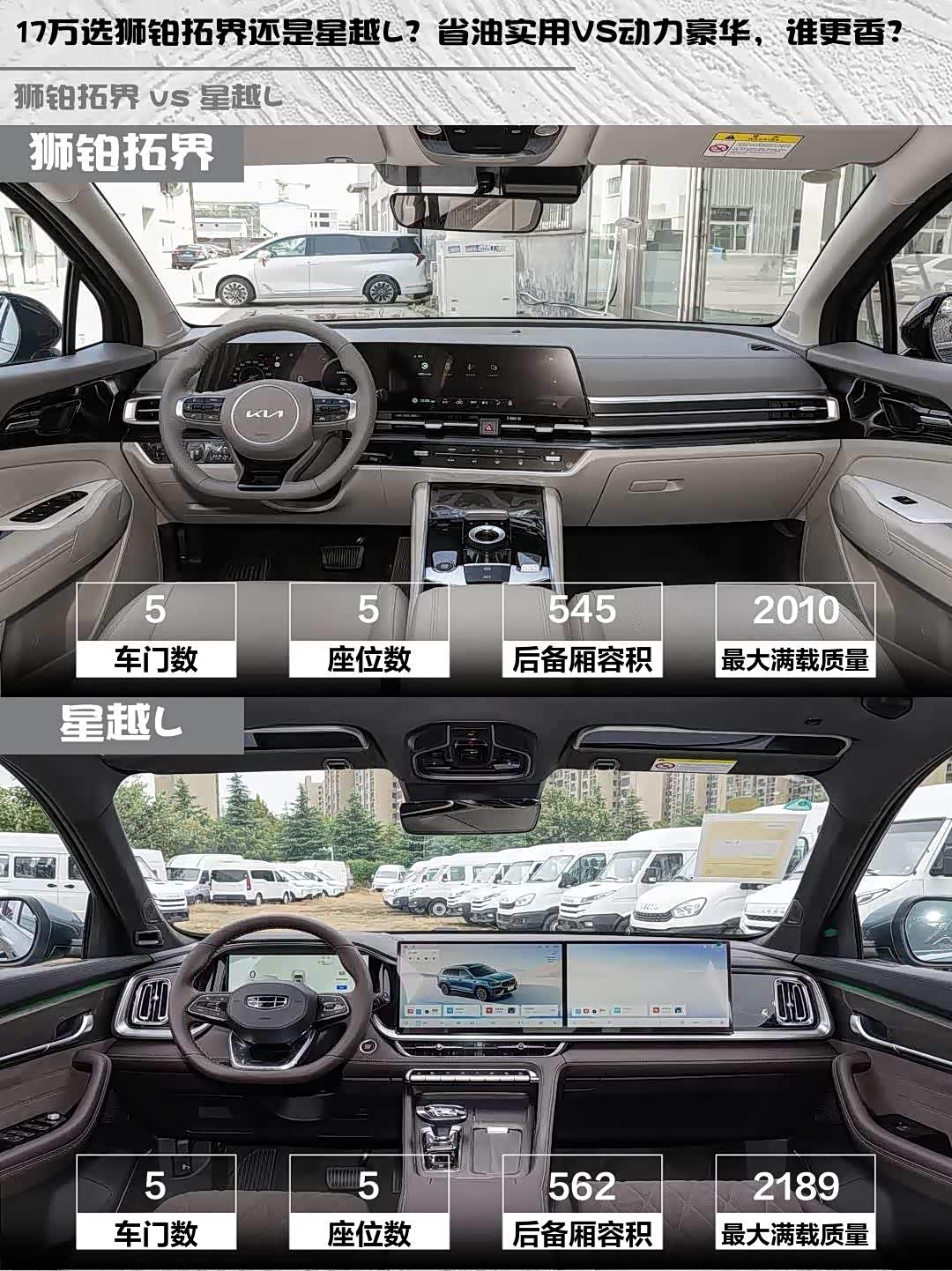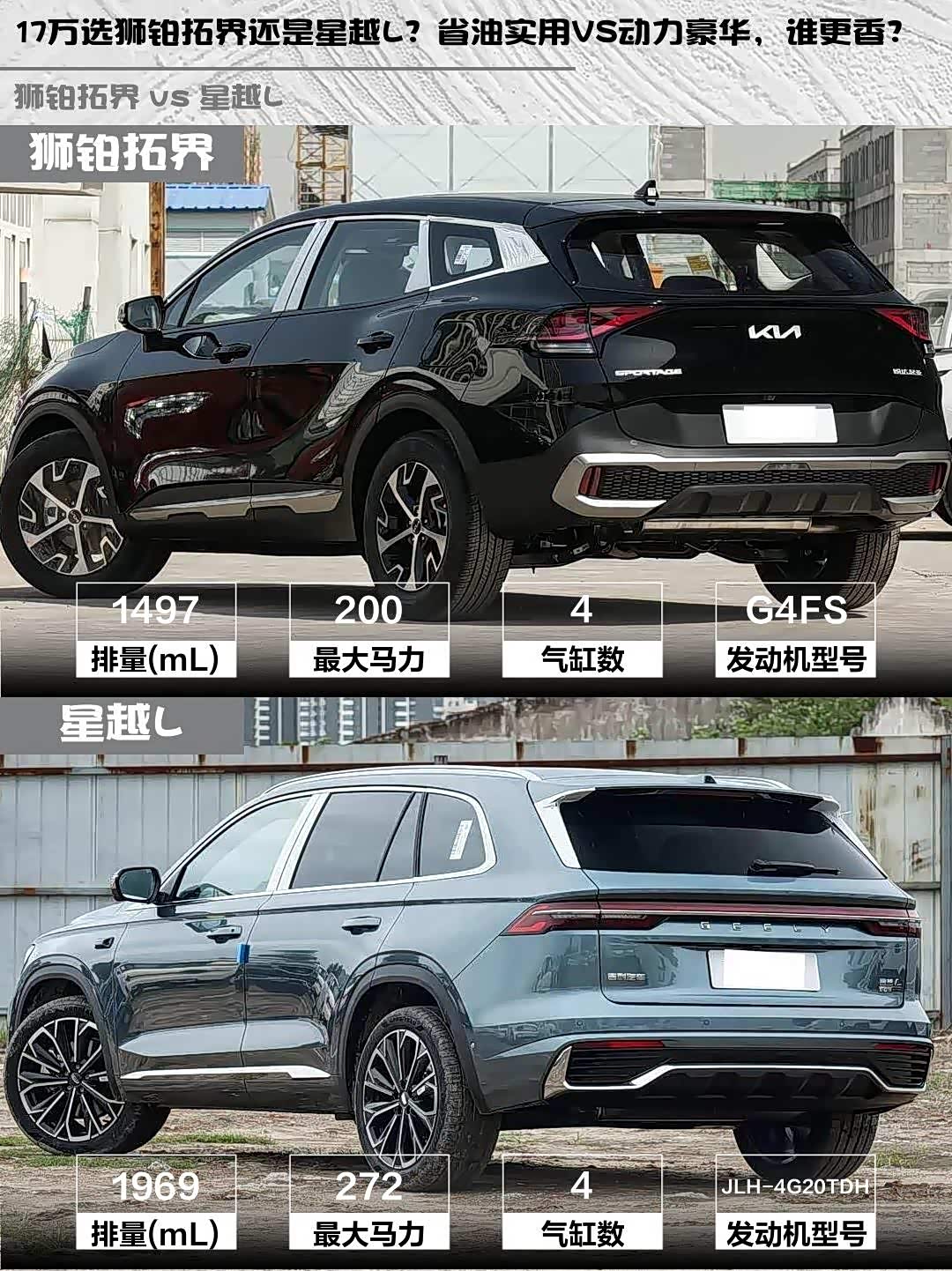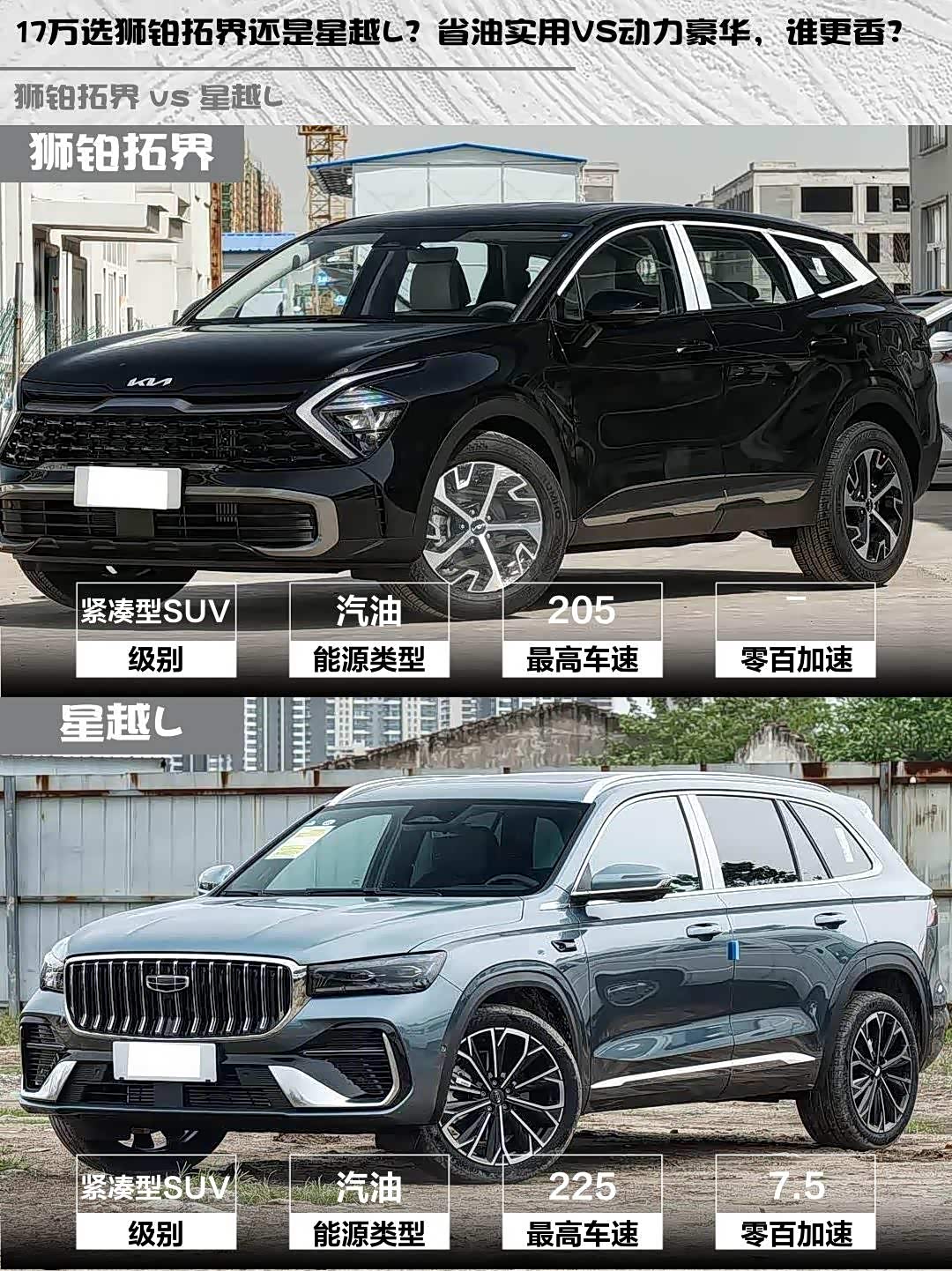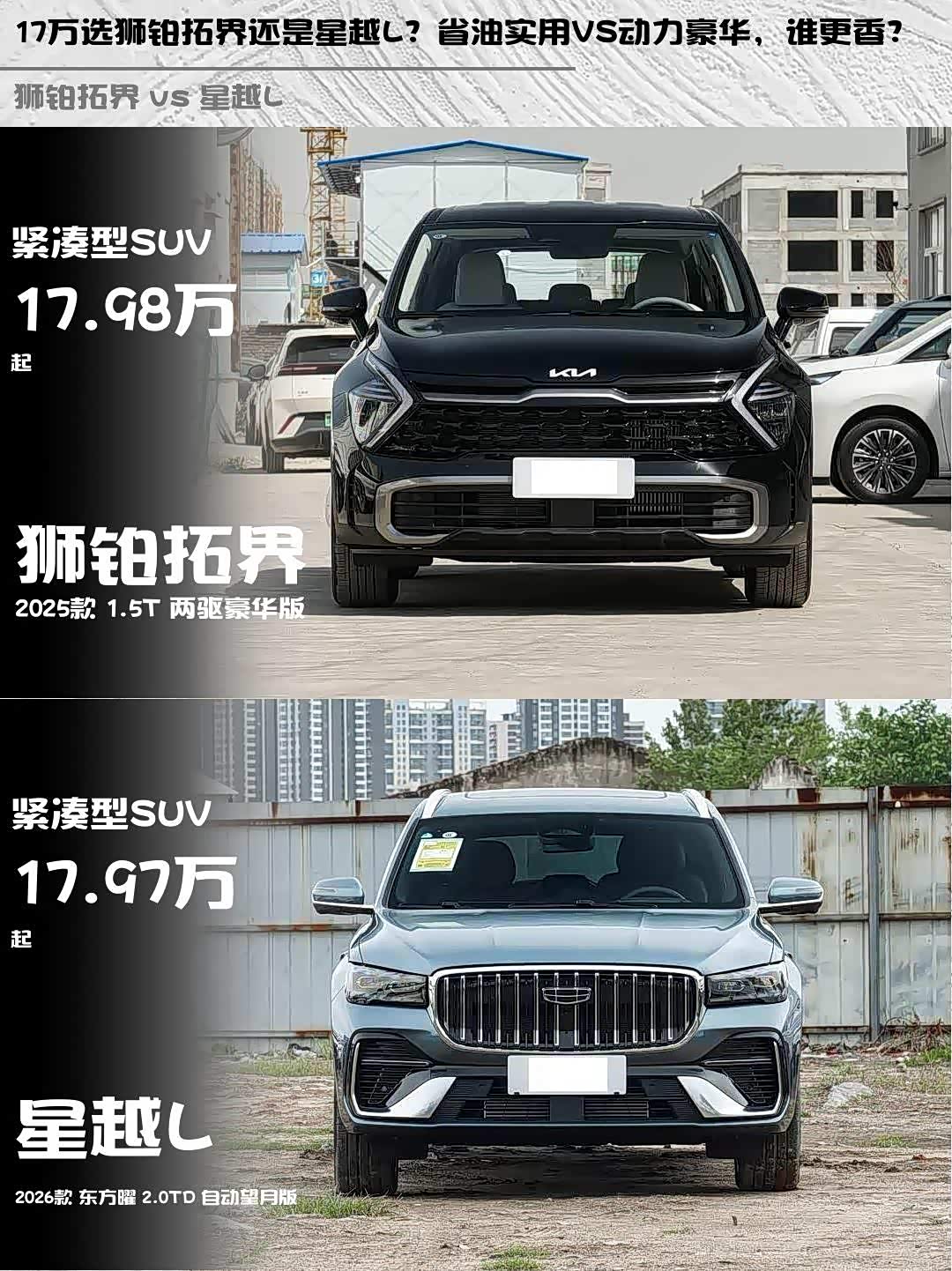 最近在选车的小伙伴看过来!🚗 今天给大家深度对比两款17万级热门SUV——起亚 狮铂拓界(参数|询价)2025款1.5T两驱豪华版和吉利星越L 2026款东方曜2.0TD自动望月版,实测干货直接上菜!👇