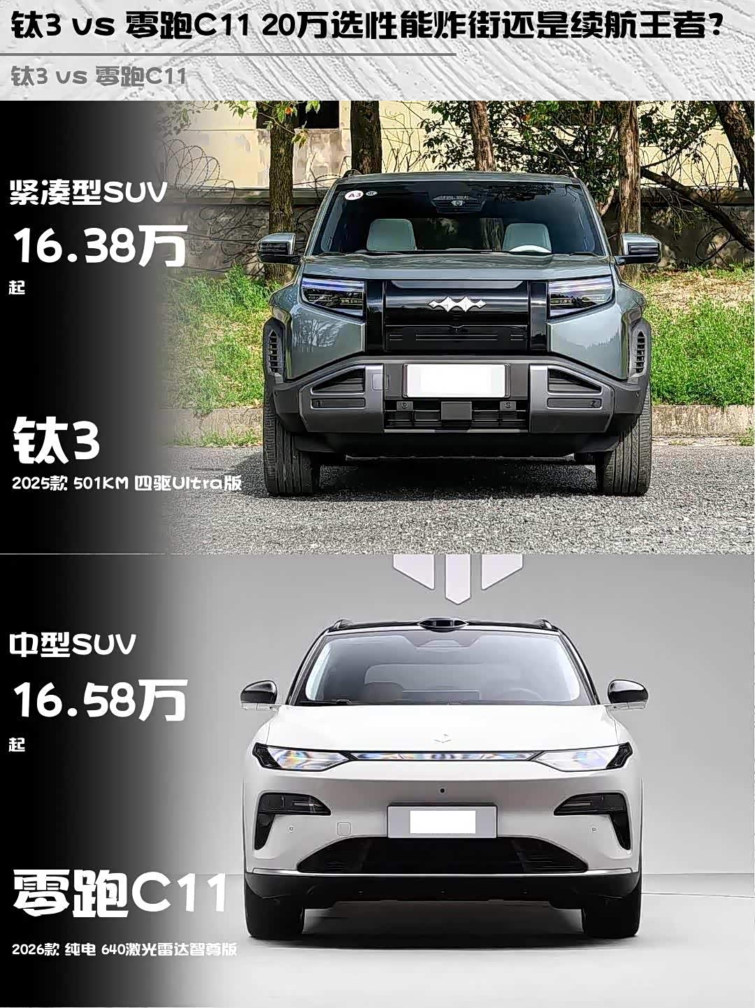 最近在选20万级纯电SUV的朋友看过来!今天深度对比两款热门选手——方程豹钛3 2025款 501KM 四驱Ultra版和 零跑C11(参数|询价) 2026款 纯电 640激光雷达智尊版,实测干货奉上🔥