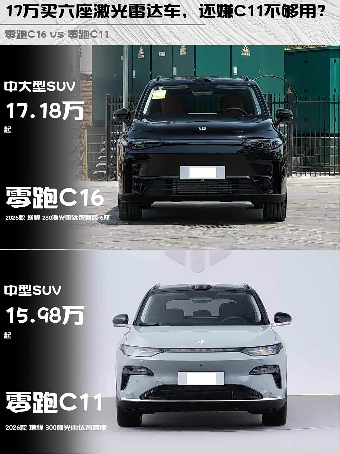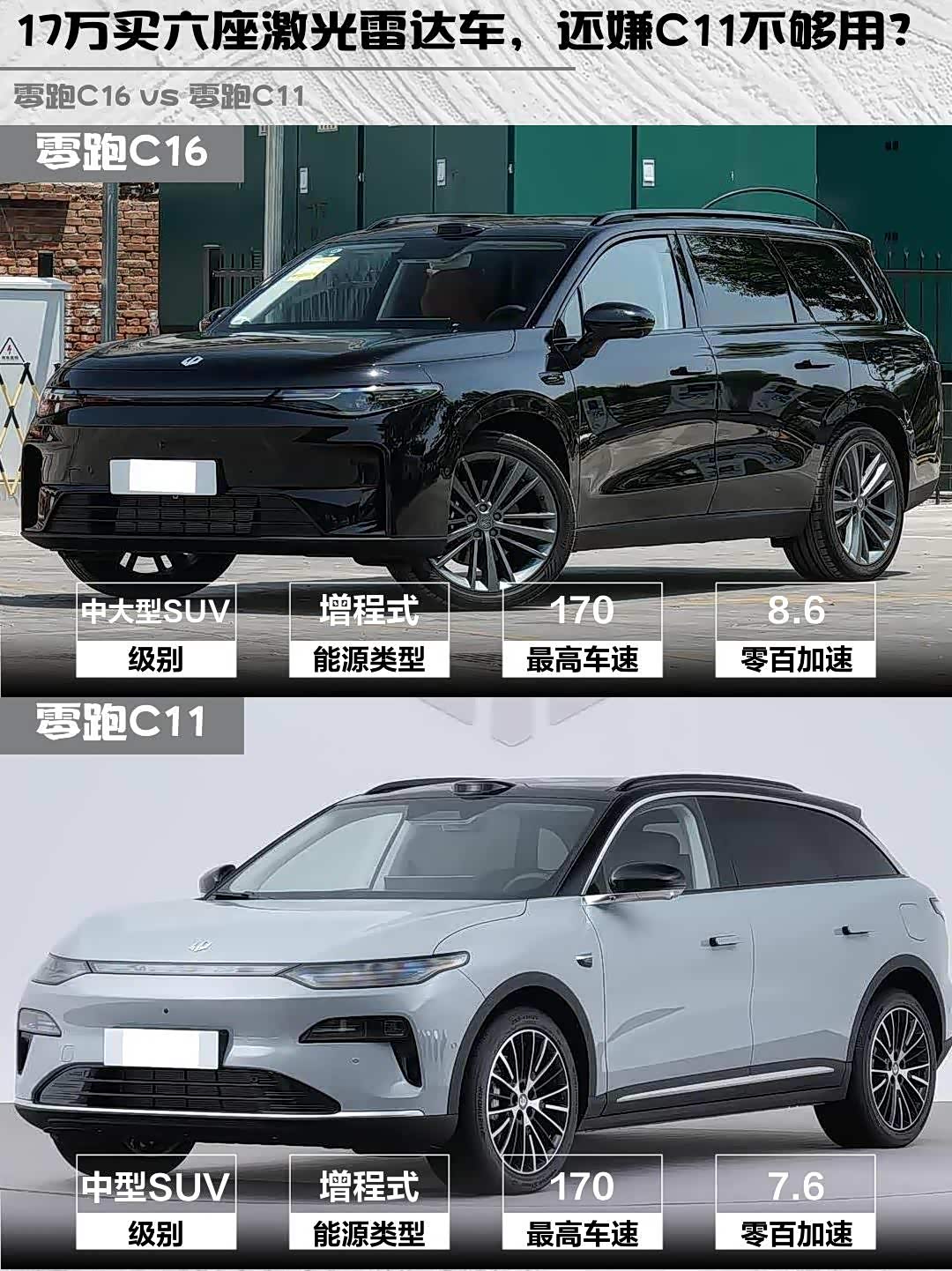 最近深度试驾了 零跑C16(参数|询价) 2026款 增程 280激光雷达智尊版 6座和零跑C11 2026款 增程 300激光雷达智尊版,两款车都是零跑家族的明星车型,但定位和体验差异还挺明显的,分享下我的感受👇