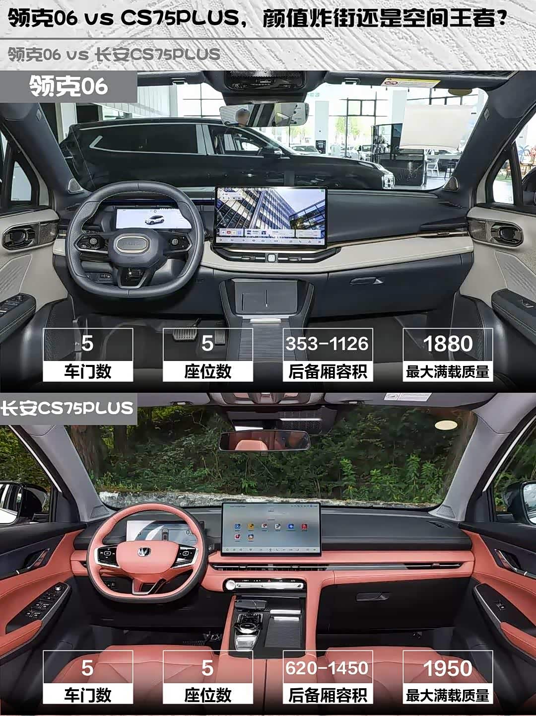 CS75PLUS后排能轻松跷二郎腿,后备箱620L起步还能变1.8米车床!领克06后排坐两人刚好,但后备箱353L更适合小家庭。周末爱露营的选长安,小两口日常代步领克更精致。