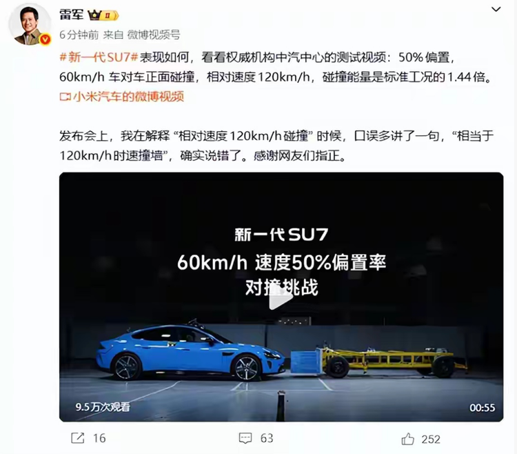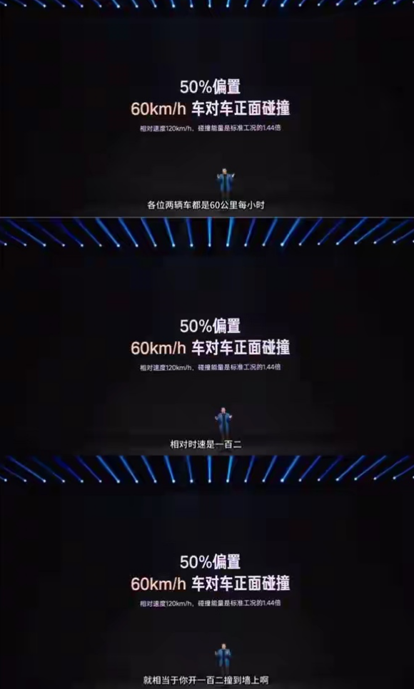 事件回溯至3月19日晚,小米新一代SU7发布会现场。雷军在介绍车辆碰撞测试成绩时提到:“两辆车都是60公里每小时,相对时速是120,就相当于你开120撞到墙上,这个碰撞能量是标准测试工况的1.44倍。”