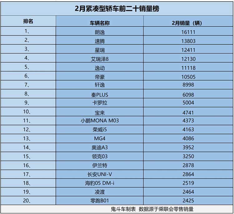 国产紧凑型轿车火了 2月紧凑型轿车销量榜 6款销量过万 逸动第五