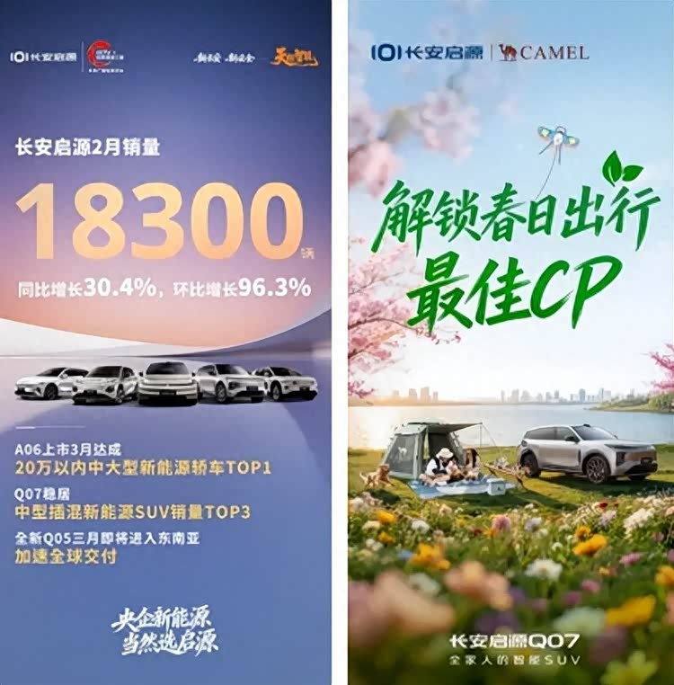 3月初,长安汽车发布2月销量151922辆,环比逆势增长12.8%;其中长安启源2月销量突破18300辆,同比增长30.4%,环比暴涨96.3%,展现出强劲的市场爆发力。在亮眼销量下,稳居中型插混新能源SUV销量TOP3的长安启源Q07再度加码市场动作,与户外出行领军品牌骆驼达成深度合作,推出“春日出行最佳CP”,共同打造家庭户外出行新场景,为用户解锁更全面的出行方案。