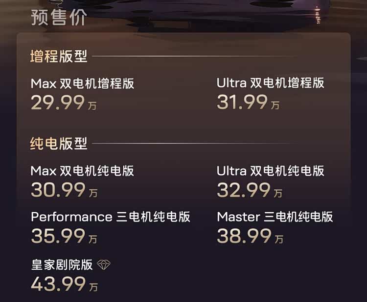 新阿维塔12提供纯电与增程双动力,共计推出7款车型,预售价为29.99-43.99万元。预售期间下订可享 2,000元意向金抵扣5,000 元大定定金的活动。根据官方信息,新车将于4月8日正式上市,目前已在全渠道同步开启预售。
