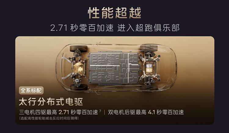 安全方面,太行分布式电驱更能助力防失控,让安全再升级,可以做到220km/h高速爆胎可稳停;92.29km/h通过雪面双移线测试;70km/h被后车美式截停碰撞,车辆保持稳定行驶;冰雪路况、湿滑环氧地库,行驶不打滑;急加速时车身无横摆。被动安全方面,新增前排中间气囊,有效降低乘员间二次碰撞风险;纯电版全系升级宁德时代麒麟电池,底部增加高强度钢防护,抗撞击能力超国标10倍。
