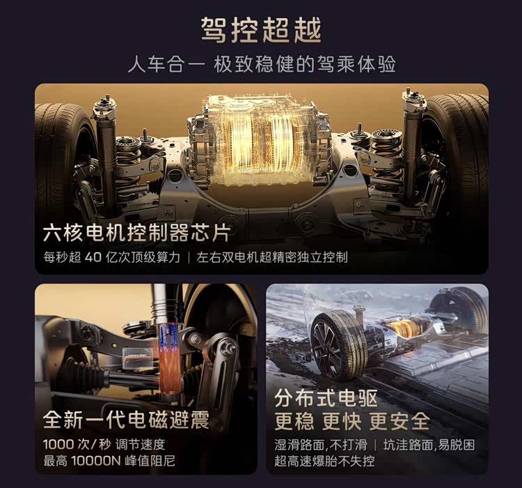 底盘系统同样出色,MAX版车型搭载法拉利同款电磁避震,拥有行业最快的系统响应速度,从最软到最硬的阻尼调节仅需10ms,调节频率高达每秒1000次。Ultra及以上版本配备优化后的空气悬架+CDC,俯仰控制提升20%,侧倾控制提升9%,为用户带来更好开、更舒适的驾乘体验。