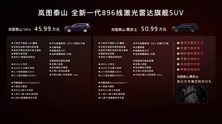 在此次发布会上,岚图汽车也迎来“全新一代896线激光雷达旗舰SUV”——岚图泰山Ultra的量产交付及泰山黑武士的重磅上市。其中,泰山Ultra版售价45.99万元,黑武士版售价50.99万元。