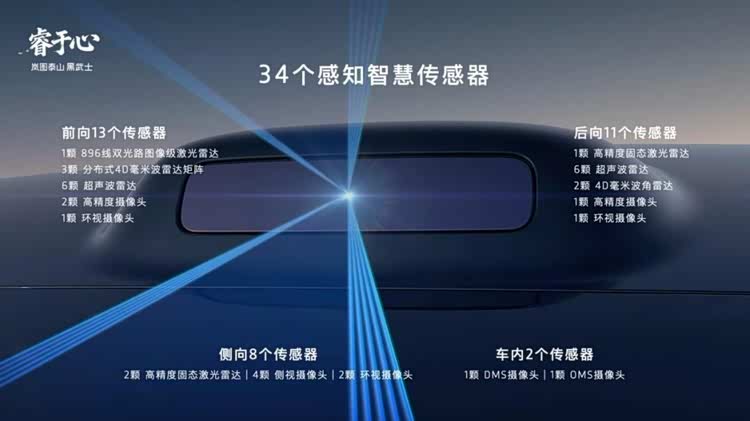 除四激光雷达外,岚图泰山Ultra版还配备丰富的融合感知传感器,包括高清摄像头、毫米波雷达、超声波雷达等共计34颗智慧传感器。多传感器融合的感知体系,帮助岚图泰山Ultra版和黑武士版搭建起全场景无死角的感知网络。