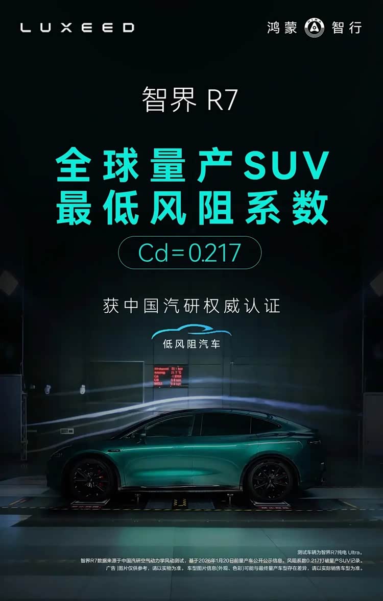 设计层面,暗夜紫与活力橙两款新车色加入,以高饱和度色调呼应年轻用户的个性表达,配合流畅的大溜背线条与低趴车身姿态,让智界双7在街头自成焦点。智界R7更以0.217的全球量产SUV最低风阻系数,将动感造型、宽适空间与超长续航融为一体,拒绝为颜值牺牲实用。