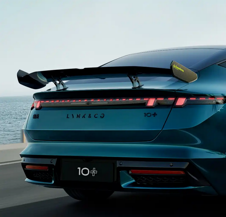 车尾部分的变化是本次改款的重点之一。领克10+引入驭风可调碳纤维后扰流板,这一配置在同级纯电轿车中并不常见。其核心作用在于根据车速和驾驶模式调整下压力,从而在高速行驶或激烈驾驶场景中提升车尾稳定性。后包围也进行了重新设计,与扰流结构形成整体空气动力方案。从功能角度分析,可调扰流板不仅影响车辆稳定性,还会对能耗产生一定影响,因此需要与整车控制系统进行联动优化。