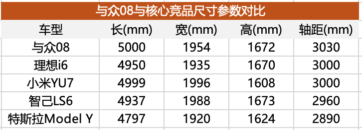 此外,与众08的轴距、车长等参数,是超过理想i6、小米YU7、智己LS6等车型的,但与众08却采用了不那么“显大”的造型风格,整体线条非常干练,侧面厚实的腰身和较高的窗线,也说明其并没有将车内视野当作核心考量。