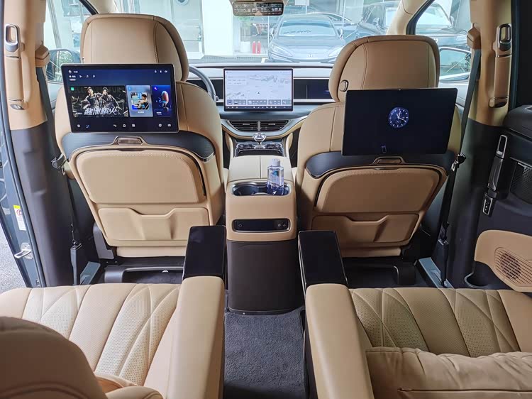 舒适配上,前排和第二排座椅都是Nappa真皮材质,具备通风、加热、10点式按摩功能,第二排零重力座椅支持一键复位,还带有折叠小桌板。除此之外,还有二三排遮阳帘、后排17.3英寸3K娱乐屏、26英寸SR-HUD抬头显示、流媒体内后视镜、23扬声器音响系统,还有12.5升车载压缩机冰箱等配置。