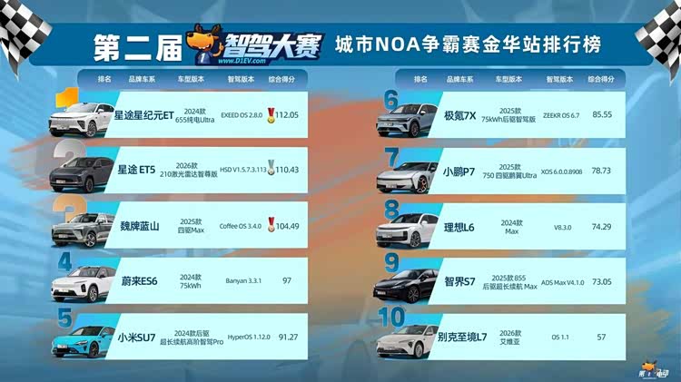 两条技术路线,同一套智驾体系,在同一个赛场上接受检验。最终的结果很能说明问题:星纪元ET以总分112.05分的成绩夺冠,ET5以110.43分拿下亚军。两台车不仅在总成绩上遥遥领先,在各个细分项目上的表现也相当稳健。
