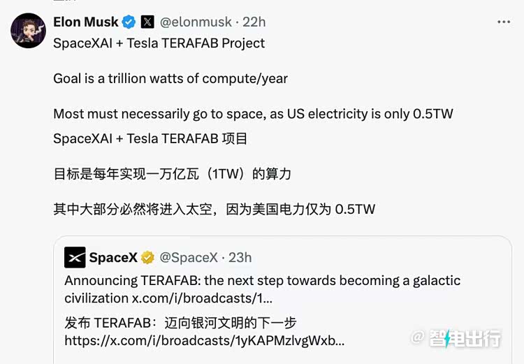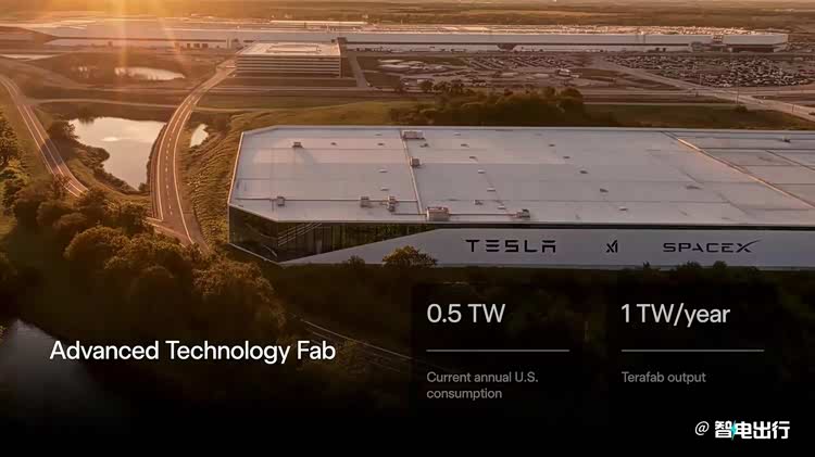 马斯克宣布,由SpaceX、特斯拉及xAI联合打造“Terafab”项目,将建成有史以来最大的芯片制造工厂。该工厂将逻辑、存储与先进封装全流程整合于一体,实现设计、制造、测试的快速迭代,目标年产1太瓦算力,约为美国全年发电量的2倍。