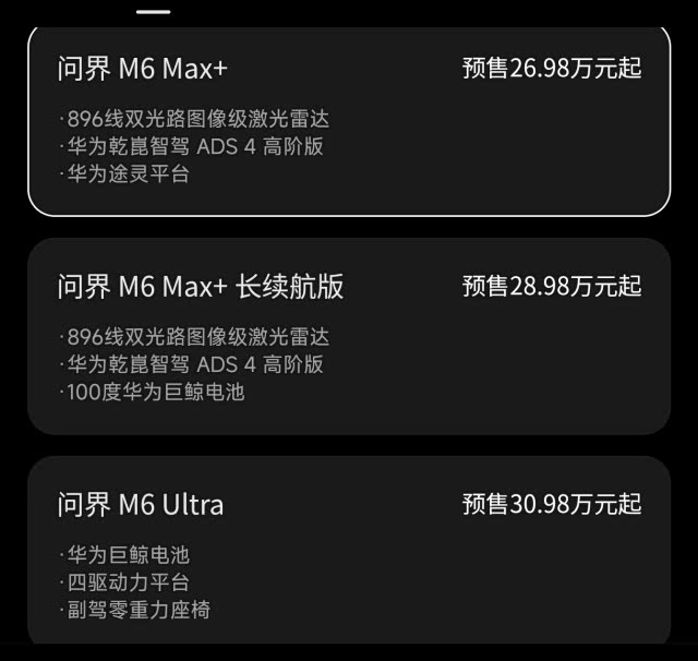 智能化部分,乾崑ADS 4.1和华为Harmony Space 5座舱是点睛之笔,都是华为最新的技术结晶,功能水平属于行业第一梯队。至于M6车型目前哪款配置更值得订?从性价比层面来讲,入门级车型Max+比较“香”,不仅有896线双光路图像级激光雷达,还有乾崑ADS 4高阶版和华为途灵平台。