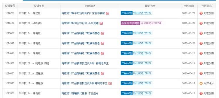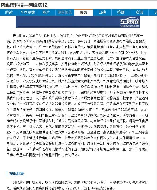 典型的投诉内容为,2025年10月28日,阿维塔12四激光版正式上市,然时隔仅73天,品牌即于工信部备案公示全新2026款阿维塔12,随后于2026年1月9日,预告了新款车型,全新款在雷达系统、电机性能、电池容量等核心配置上全面升级,属实质性大改款,与四激光版差异显著。