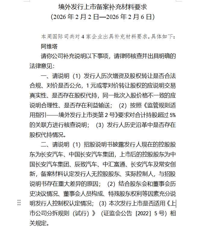 需要关注的是,2026年以来,阿维塔的发展并不顺畅,不仅仅是遭到一众老车主的投诉引发舆论风波。此前不久,在阿维塔2026年工作重心的IPO方面,也遇到证监会的合规性“问询”。2月6日,证监会向正在筹备香港上市的阿维塔发出一份涉及六大领域的备案反馈意见。