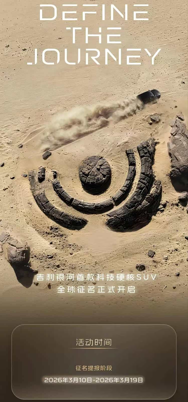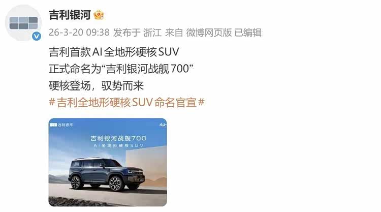 3月20日,吉利银河官宣,吉利银河首款AI全地形硬核SUV正式定名为——吉利银河战舰700。据了解,这一命名采用“用户共创” 方式,源自全球用户征名活动。