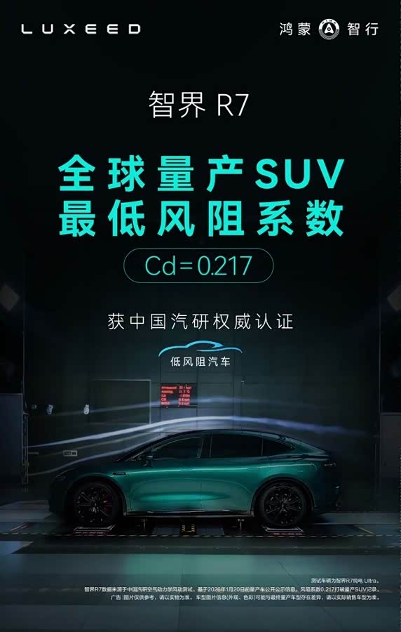 在看不见的地方同样追求极致。智界R7通过3D曲面前轮阻风板、主动式进气格栅等多项空气动力学设计,实现了0.217cd的全球量产SUV超低风阻系数;智界新S7则以浑然一体的车身曲线,带来0.203Cd的全球量产车Top级超低风阻表现。这不仅意味着更低的能耗与更长的续航,更是对造车工艺和设计美学的极致追求。