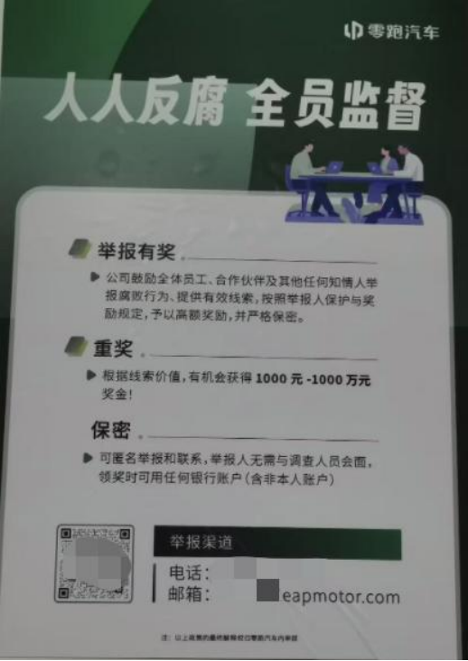 为形成全方位监督态势,零跑同步推出“人人反腐、全员监督”机制,面向内部员工、供应商、经销商及社会知情人广泛征集贪腐线索,涵盖收受贿赂、吃回扣、围标串标、利益输送、虚报费用等全场景,经查证属实,举报奖励最高可达1000万元,创下国内车企反腐举报奖励新高。