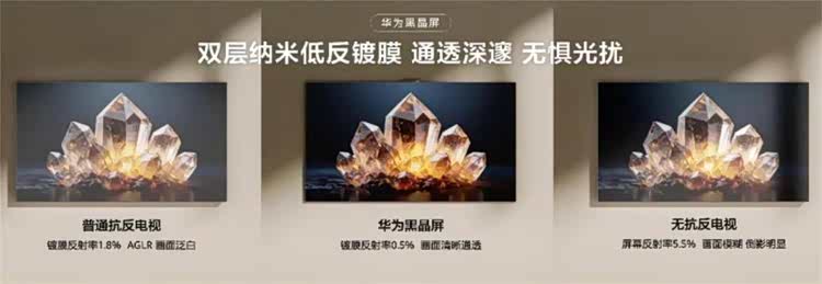 华为Vision智慧屏 6搭载了华为黑晶屏,只为更极致的观影体验。屏幕外层为双层纳米低反镀膜,膜片反射率低至0.5%,能有效抑制环境光干扰;内部则采用第六代液晶屏,相比上一代透光率提升20%,让画面亮得璀璨、细节分毫毕现。