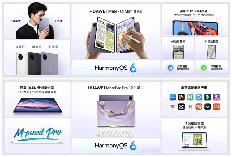 华为MatePad Pro 12.2 英寸搭载丰富鸿蒙电脑应用,天生会画App悬停预览再升级,12mm悬浮高度助力精准操作;华为MatePad Mini 悦读版超轻薄机身设计,配合华为阅读App带来AI眼动翻页、AI动态图书功能,让阅读更沉浸有趣。