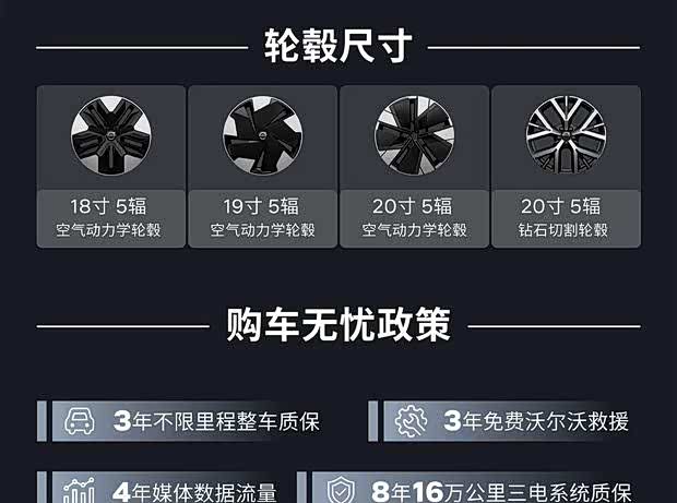 在动力性能上,单电机后驱版本最大功率为200千瓦,0-100公里/小时加速时间分别为5.7秒与5.3秒,电量从10%充至80%所需时间约为26至28分钟,对应的CLTC续航里程分别为410公里和590公里。双电机四驱版本综合功率达到315千瓦,0-100公里/小时加速仅需3.6秒,10%-80%充电时间为28分钟,CLTC续航里程为540公里。