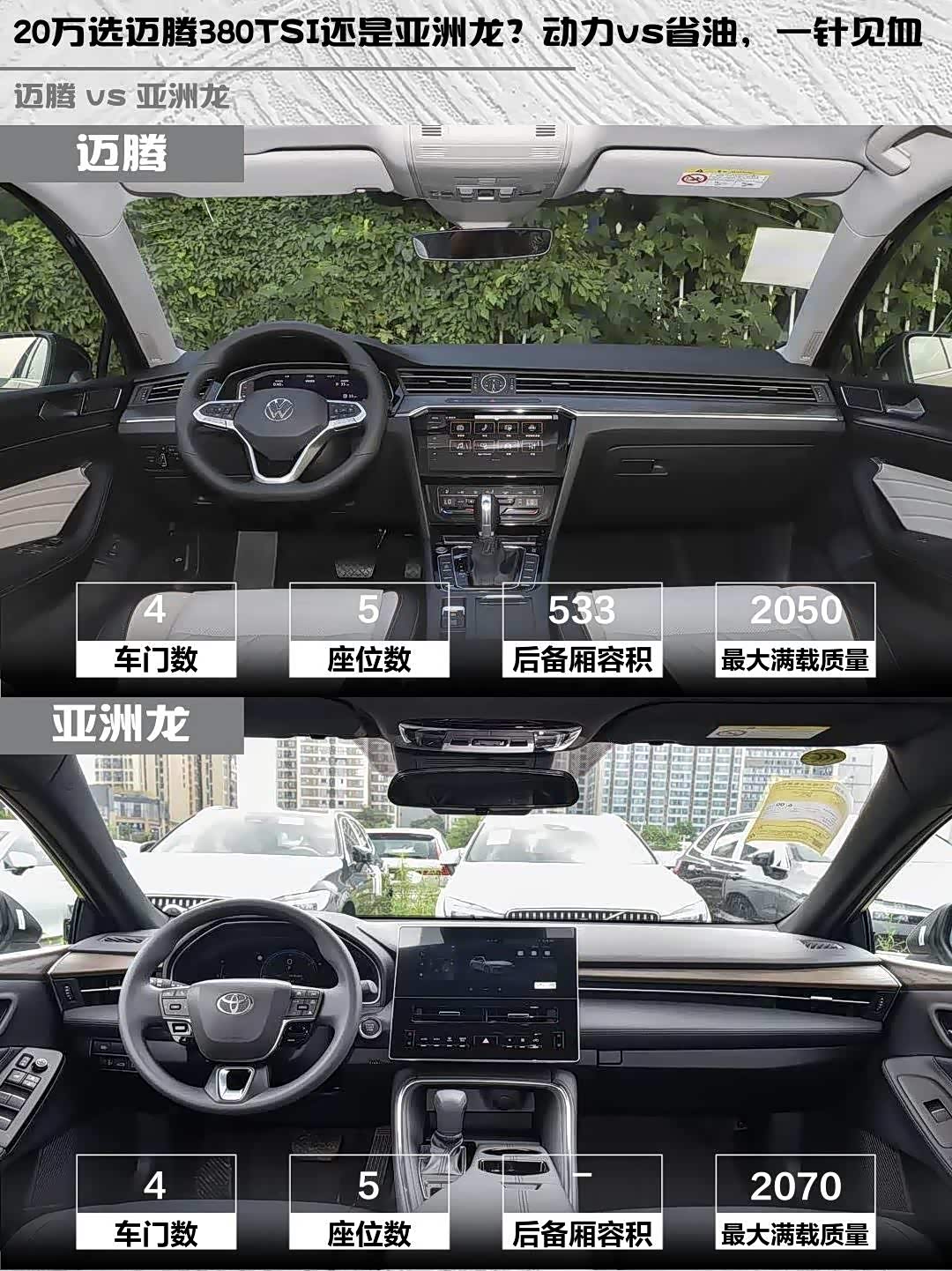 要动力操控选迈腾,要省心耐用选亚洲龙。不过偷偷说一句,现在迈腾终端优惠挺大,380TSI豪华型落地价比指导价还香,这波真的可以冲!