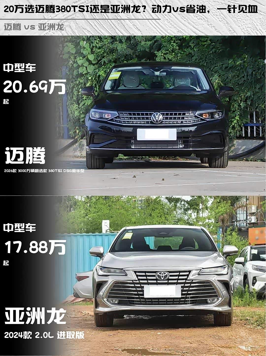 最近后台好多兄弟在问:20万预算,迈腾和 亚洲龙(参数|询价)到底怎么选?🤔 今天直接拿2026款迈腾380TSI豪华型和2024款亚洲龙2.0L进取版来场硬核对比,看完保你心里有数!
