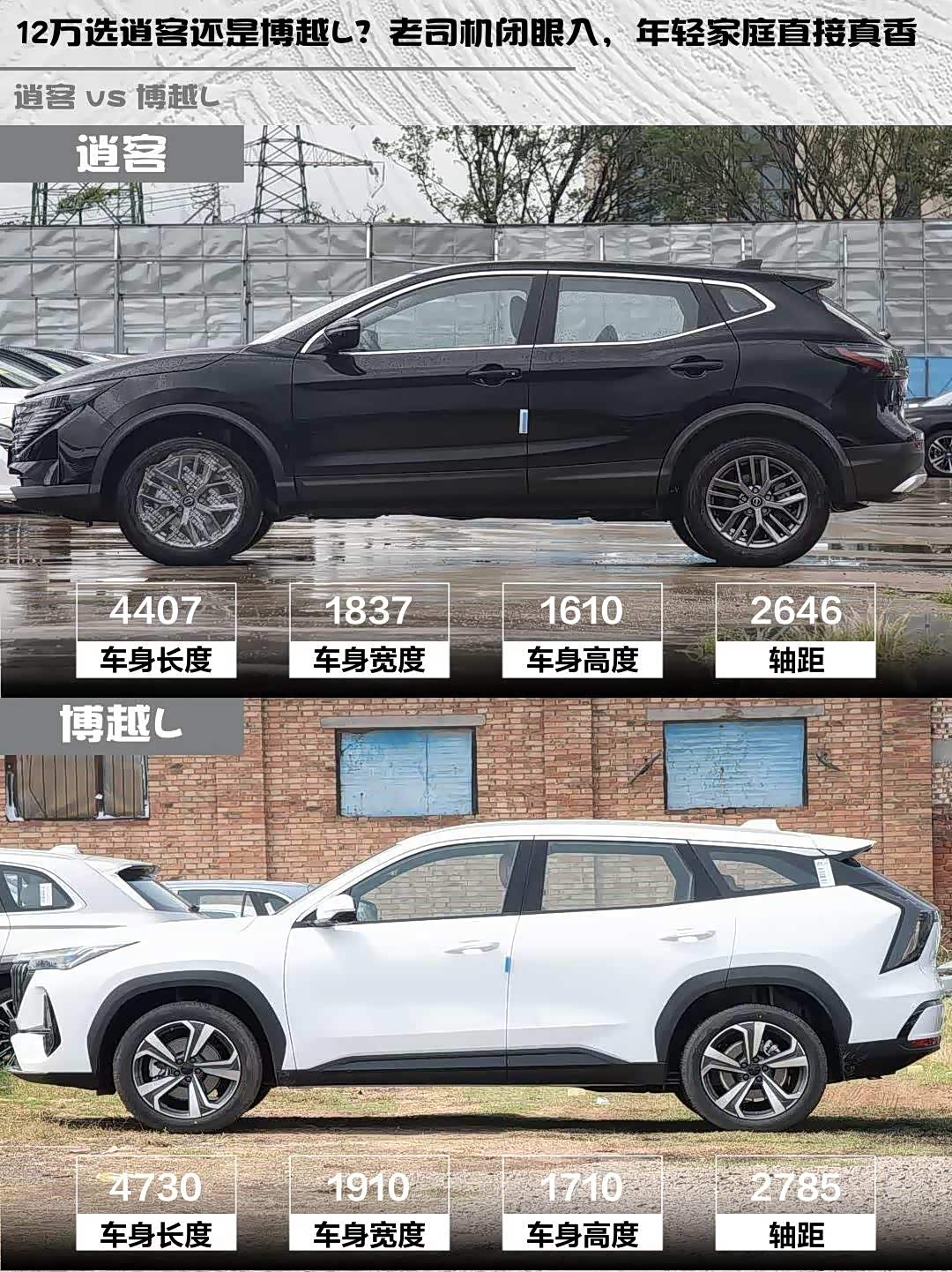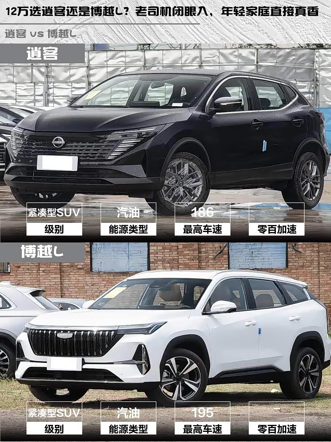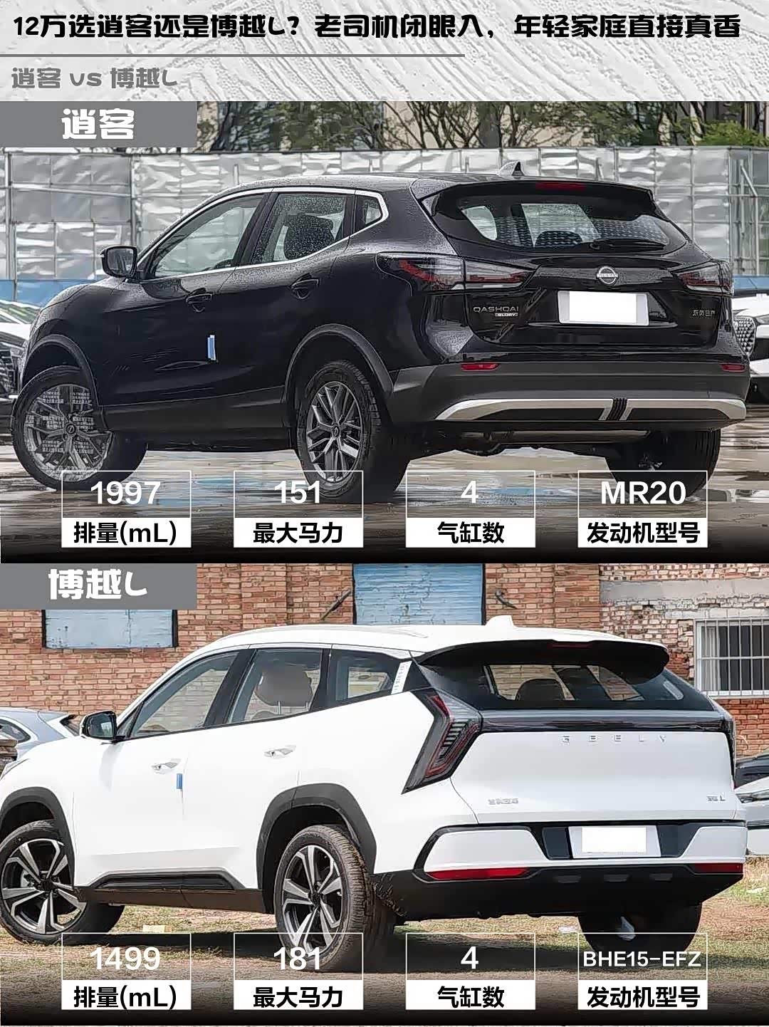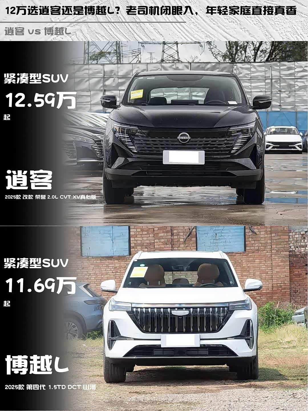 车家号·0浏览·2026-03-24 08:20 · 北京逍客2025款改款荣誉2.0L CVT XV真心版 vs 博越L(参数|询价) 2025款第四代1.5TD DCT山河,12万级SUV怎么选?🤔
