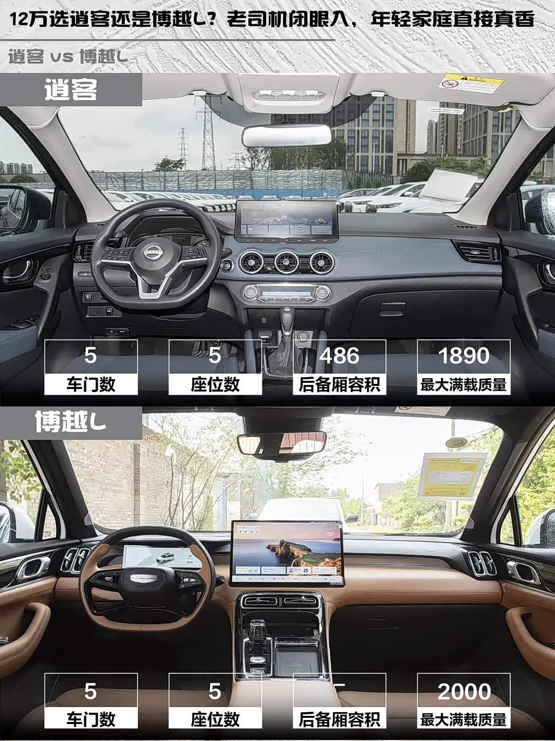 逍客4407mm车长+486L后备箱够用,但后排地台凸起明显。博越L直接降维打击:4730mm车长+纯平地台,后排能跷二郎腿!配置上逍客12.3英寸中控屏+定速巡航够用,但博越L给到15.4英寸巨屏+L2辅助驾驶+360影像+电动尾门,国产车配置内卷起来真狠...