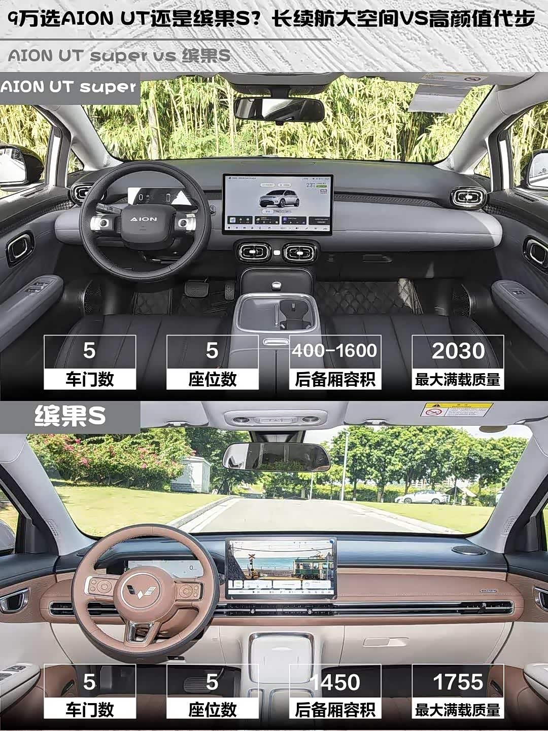 AION UT super的136马力电机起步更迅猛,高速超车底气足🚀。缤果S的方向盘调校更轻巧,女生单手揉库无压力。NVH控制上AION UT super略胜一筹,胎噪抑制得更好。不过缤果S的底盘滤震更柔和,过减速带更舒服。