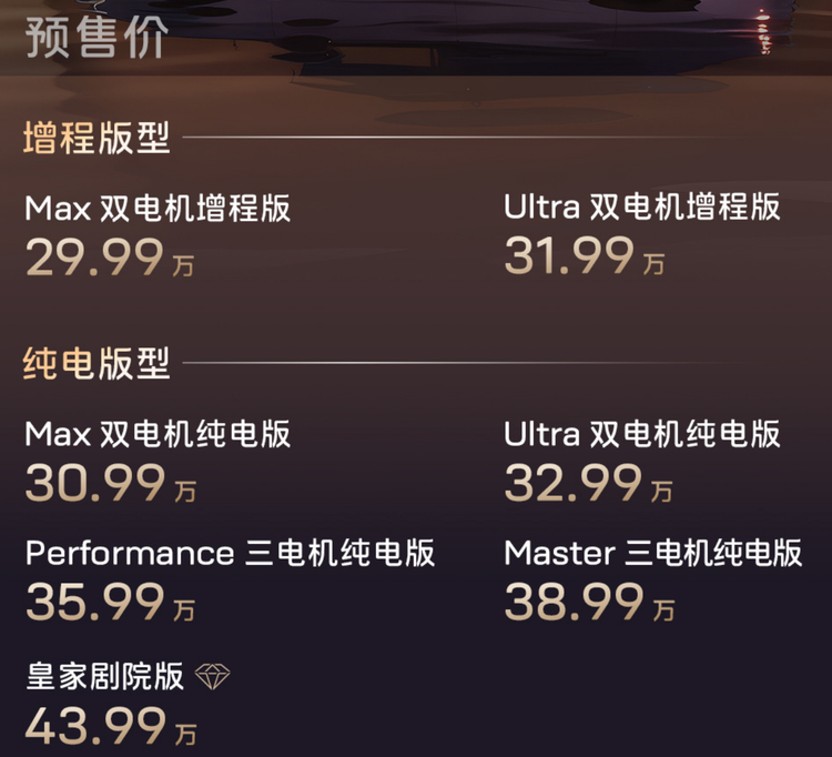 此外,还将搭载华为途灵平台,配备华为巨鲸电池平台,车辆分别推出单电机和双电机版本,前者最大马力359匹,后者最大马力590匹,零百加速最快3.44秒,在CLTC工况下纯电续航里程可达905km。