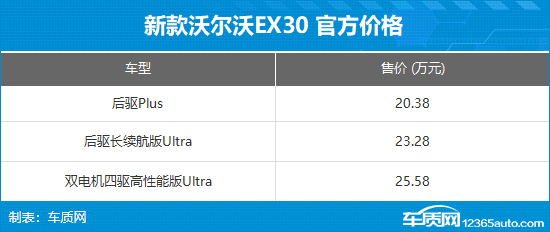 3月20日,新款沃尔沃EX30正式上市,新车推出3款配置,厂商指导价20.38-25.58万元,限时参考尊享价15.98-20.98万元,入门版配置大幅提升,进一步强化市场竞争力。购车权益方面,新款EX30提供3年不限里程整车质保、8年16万公里三电质保、3年免费救援及4年媒体流量,兼顾豪华品质与用车保障,以高性价比切入豪华纯电小型SUV市场。