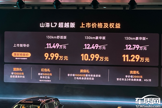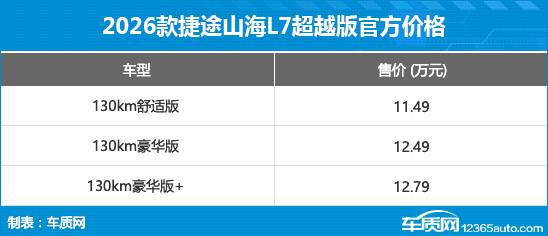 3月19日,2026款捷途山海L7超越版在安徽芜湖正式上市,新车共推出3款车型,官方指导价区间为11.49-12.79万元,限时抢购价为9.99-11.29万元。同时,官方还推出质保礼、流量礼等上市权益。