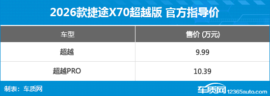 3月19日,2026款捷途X70超越版在安徽芜湖正式上市,新车共推出2款车型,官方指导价区间为9.99-10.39万元,限时抢购价为6.99-7.39万元。同时,官方还推出价值6888元质保礼等上市权益。
