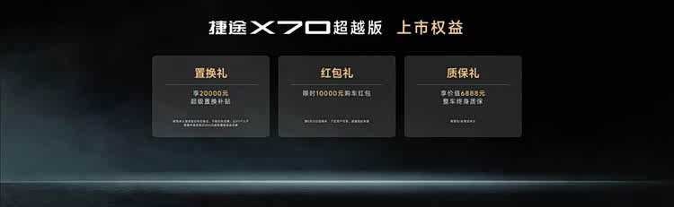 发布会现场,2026款捷途X70超越版的官方指导价及专属购车权益正式公布。2款车型官方指导价9.99万元-10.39万元,提供3重购车豪礼,限时抢购价6.99万元-7.39万元,让更多家庭轻松拥有顾家派宽体大七座,奔赴向往的生活。