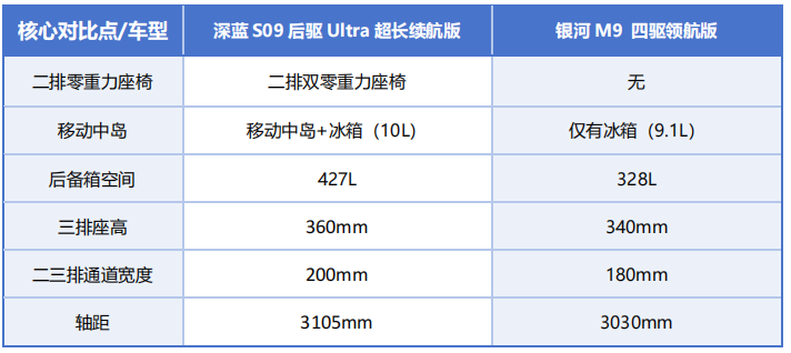 综合来看,两款车型各有所长,同时基于定价、优惠与配置的差异,市场定位也是各有侧重。银河M9以“基础实用+亲民定价”切入市场,适配注重性价比、需求相对简单的家庭用户;深蓝S09后驱Ultra超长续航版则以“全配置拉满+诚意优惠”立足,覆盖追求高品质、全场景出行的家庭用户,是25万级价位段兼顾家用与商务、拒绝妥协的优选座驾。