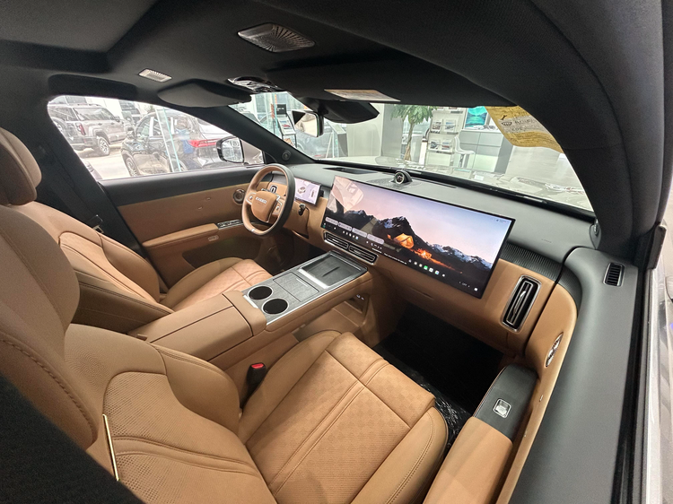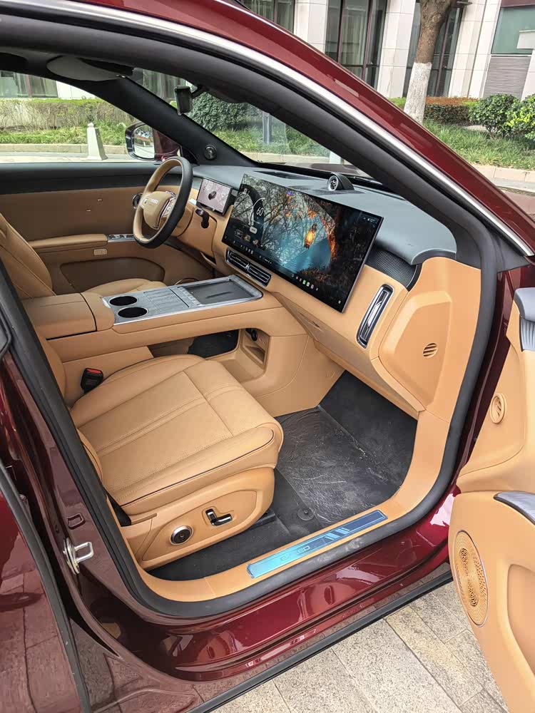 内饰也有晨曦棕、静谧灰两种风格,简洁的环抱式座舱内配备30吋6K寰宇一体屏,配合矩形仪表屏以及24吋W-HUD抬头显示,营造科技氛围,并搭载5nm高通骁龙8295P芯片加持的AI灵犀智舱2.0。同时大量皮质包覆配合木纹饰板点缀、256色星河流光氛围灯以及中置扬声器,继续强调豪华气息,此外还将配备双幅式多功能方向盘+电子怀挡、50W手机无线快充、一排物理按键等。