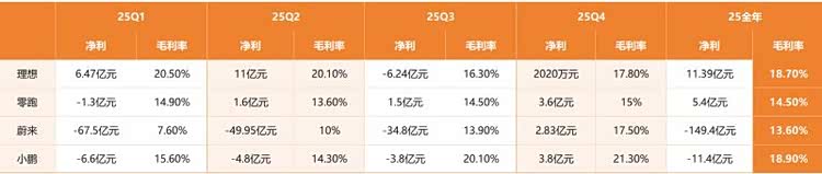 随着小鹏财报出炉,蔚来、小鹏、理想、零跑四家已登陆资本市场的新势力车企2025年业绩已全部揭晓。整体来看,理想汽车实现全年持续盈利,零跑汽车首度达成年度盈利,蔚来、小鹏则在四季度双双实现成立以来首次单季盈利。