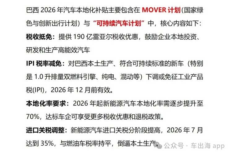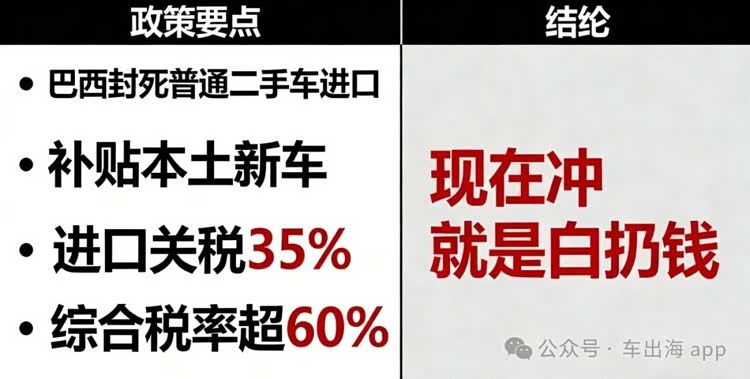 更关键的是,补贴仅针对巴西本土生产的新车,进口二手车完全没有补贴资格,再加上进口流程繁琐,需提前申请许可证、办理合规认证等一系列手续,涉及多个政府部门,耗时耗力,现在贸然入场,大概率是成本收不回、订单拿不到,纯纯做无用功。