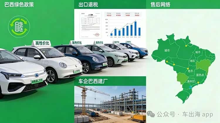 其次是政策契合度,巴西正推行“绿色IPI”减税政策,对新能源车型给予税率优惠,而我国新能源二手车品类齐全、技术成熟,完美契合巴西的绿色发展导向,这是我们的核心突破口。另外,国内有13%的出口退税政策加持,部分地区还将优质出口企业退税办理时间压缩至2个工作日,大幅降低出口成本;同时,长城等中国车企已在巴西建厂,搭建了完善的售后服务站和零部件仓库,我们出口二手车完全可以搭便车,解决售后痛点。