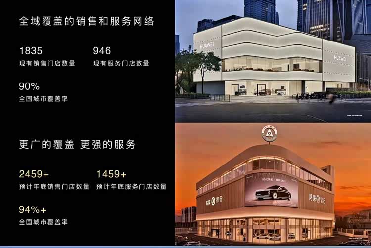 截至目前,鸿蒙智行已拥有1835家销售门店、946家服务门店,覆盖90%的城市,预计年底将分别增至2459家、1459家,甚至将服务延伸到偏远地区,打破“高端服务只在大城市”的固有认知。